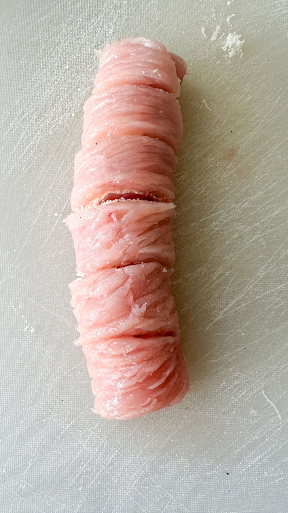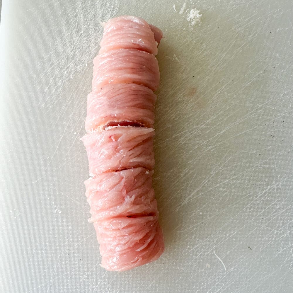 | 4. | Putenschnitzel aufrollen und in gleichmäßige Stücke schneiden. |