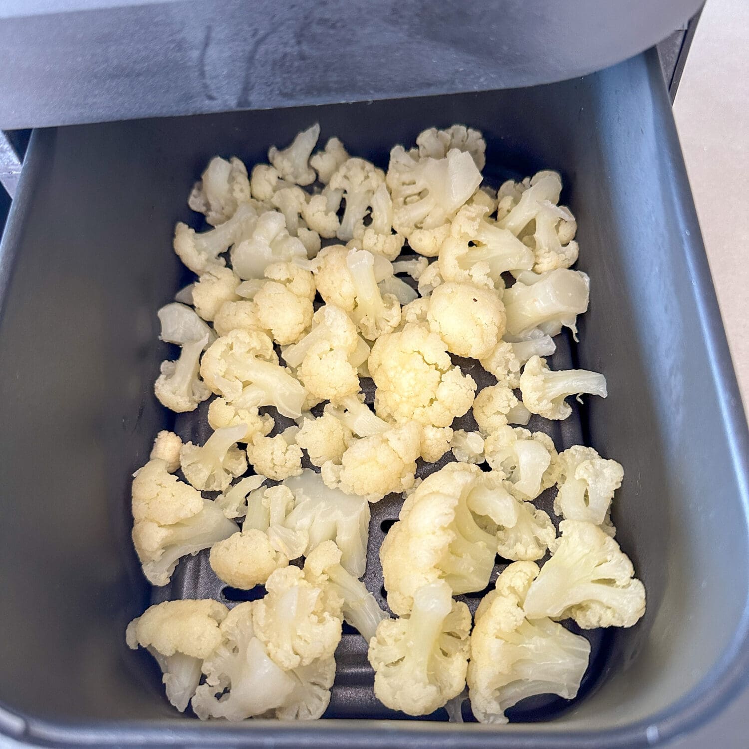Inzwischen den Blumenkohl in Röschen teilen, kochen und circa 10 Minuten in der Heißluftfritteuse bei 200 Grad rösten. |