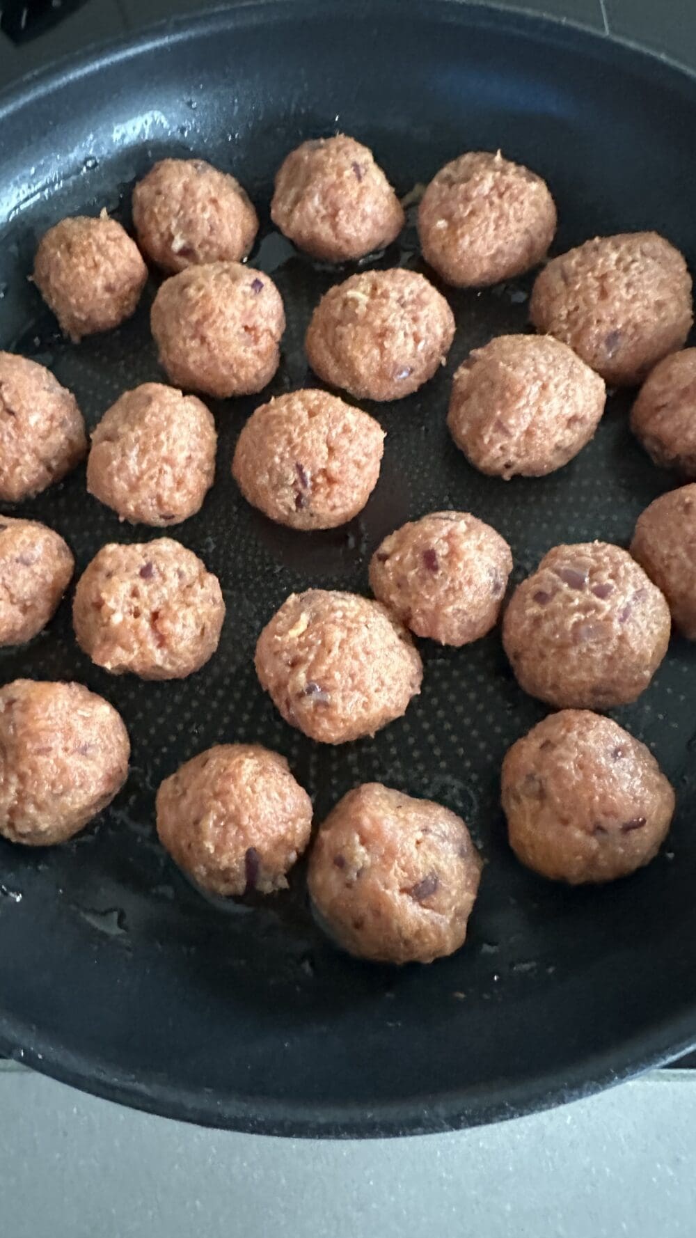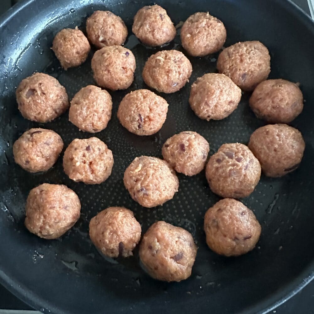 | 3. | …in 2 EL Öl von allen Seiten circa 5 bis 7 Minuten scharf anbraten. Wenn die Bällchen größer sind, dann länger braten, bis sie durch sind! |
