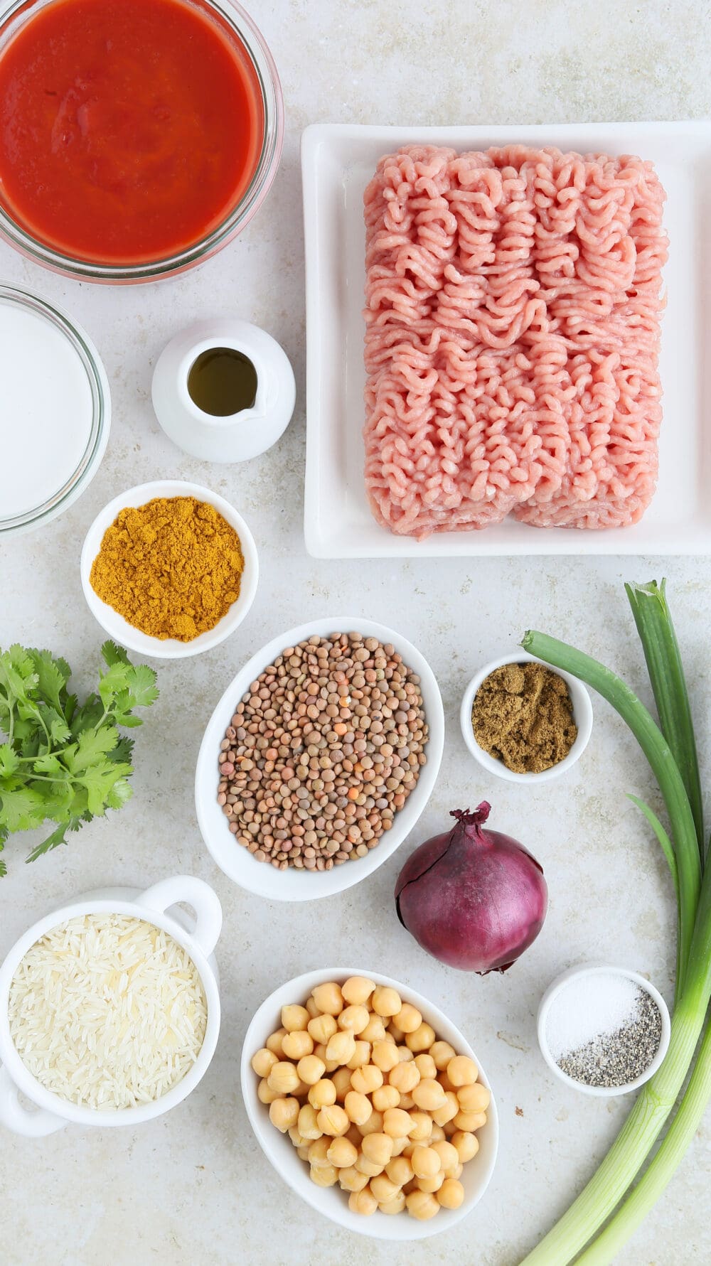 Don`t worry, eat Curry! Am besten in dieser köstlichen Version: Saftige Bällchen aus Putenhackfleisch mit Linsen in einer cremigen Tomaten-Kokossauce mit viiiieeel Curry gegart und mit Reis und Kichererbsen vereint. Yummy!
