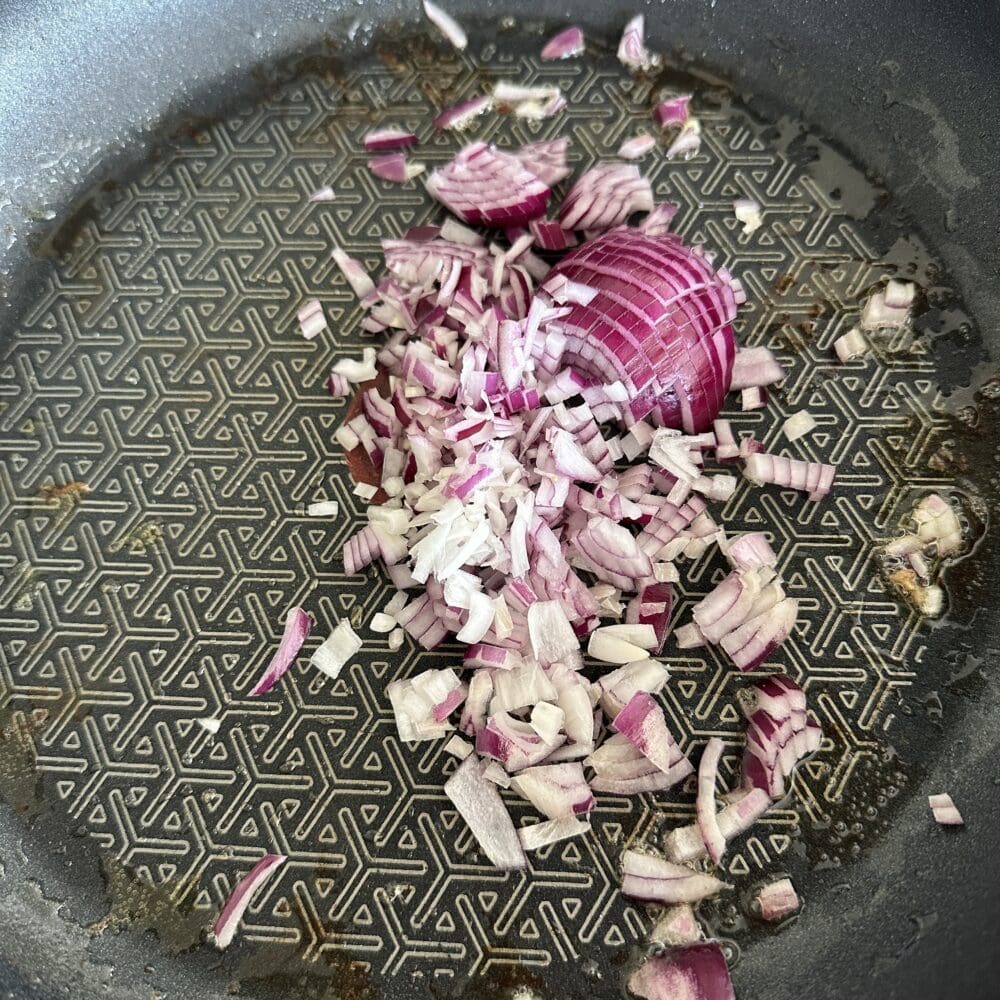 | 5. | Jetzt die Zwiebel schälen, fein würfeln und in dem Bratfett anschwitzen. |