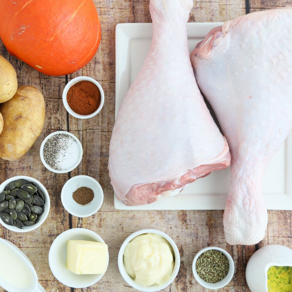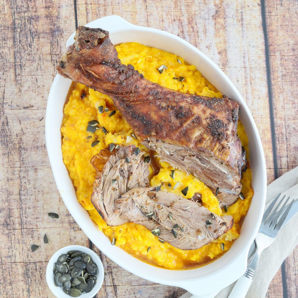 Putenkeulen auf dem Kürbis-Kartoffelpüree anrichten und mit Kürbiskernen genießen. |