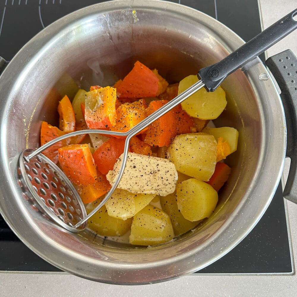 Kürbis und Kartoffeln weichgaren und mit Butter, Muskat und Sahne pürieren und mit Salz und Pfeffer abschmecken. |