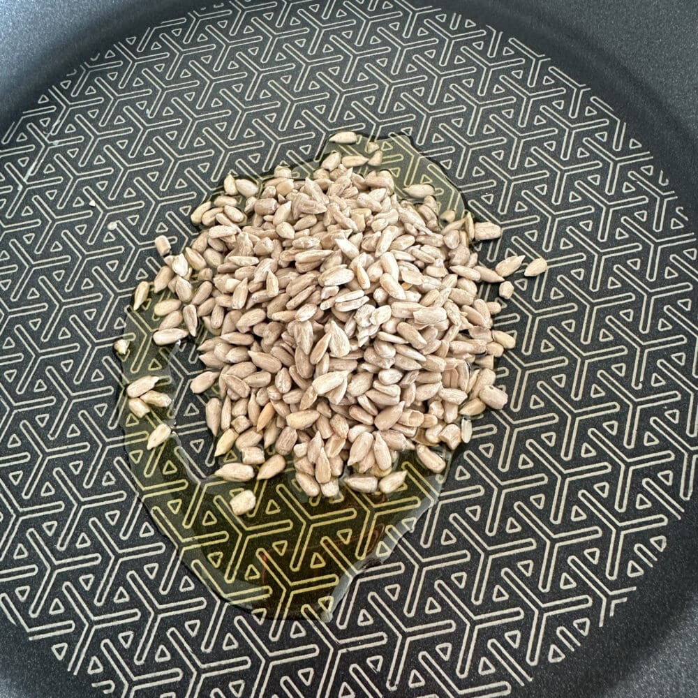 Dann die Sonnenblumenkerne in 1 EL Öl anrösten und abkühlen lassen. |