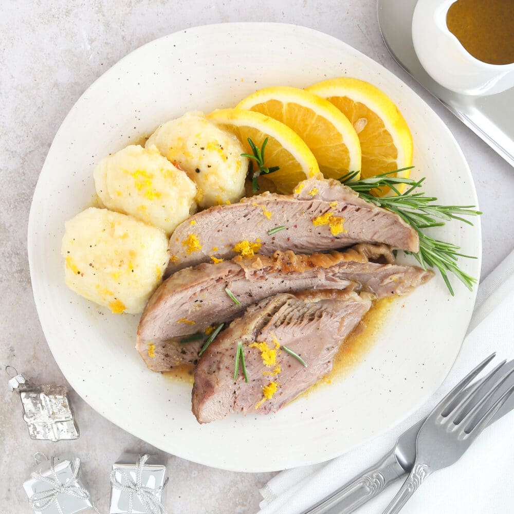 Zuerst die Putenunterkeulen in dem Öl in einem Bräter von beiden Seiten scharf anbraten und kurz zur Seite stellen.