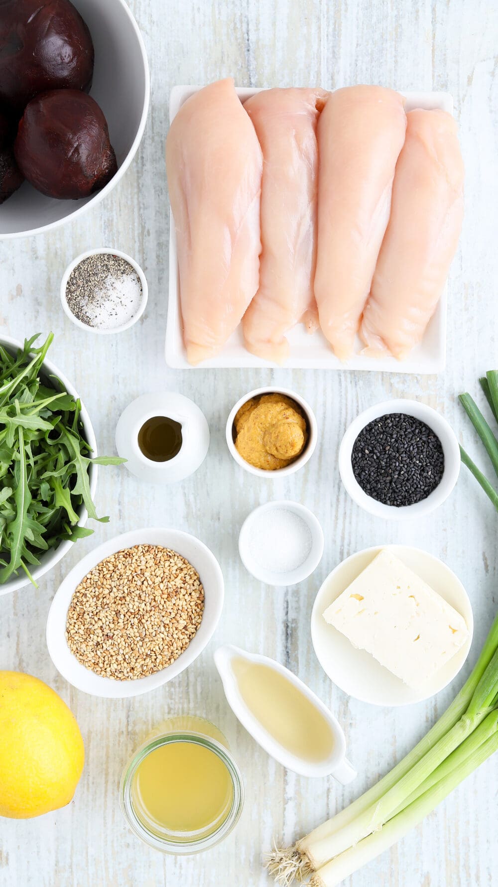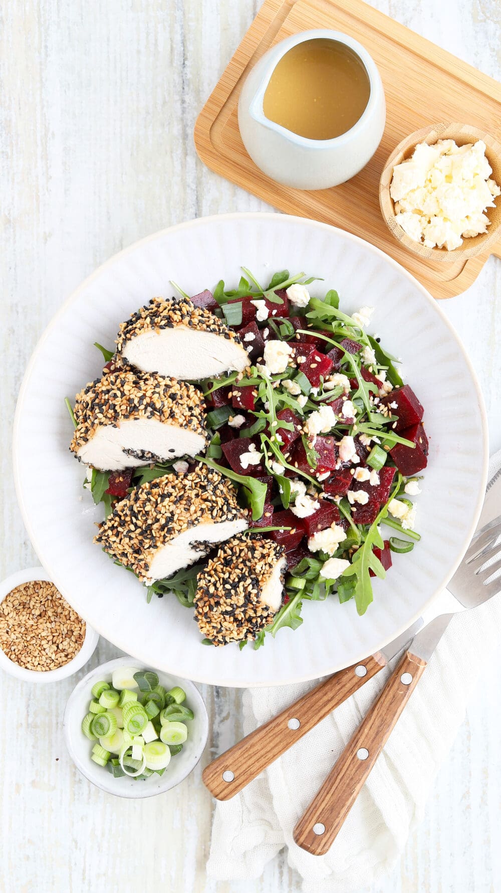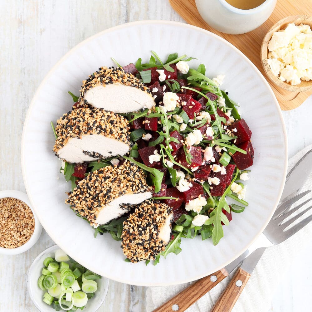 Sesam-Hähnchen auf Rote Bete Salat mit Rucola und Feta