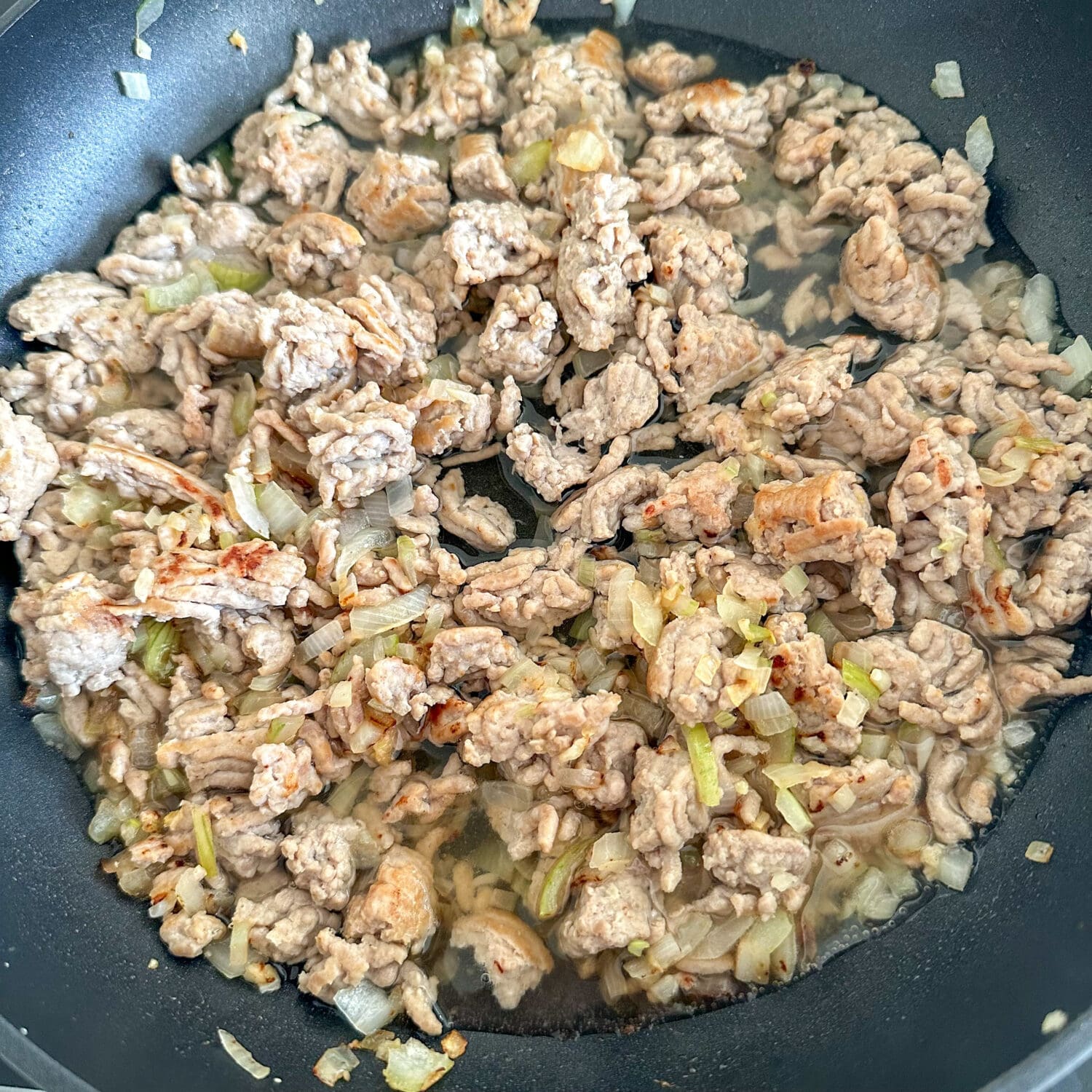 Zuerst das Hähnchenhackfleisch in dem Öl circa 5 Minuten scharf anbraten. |