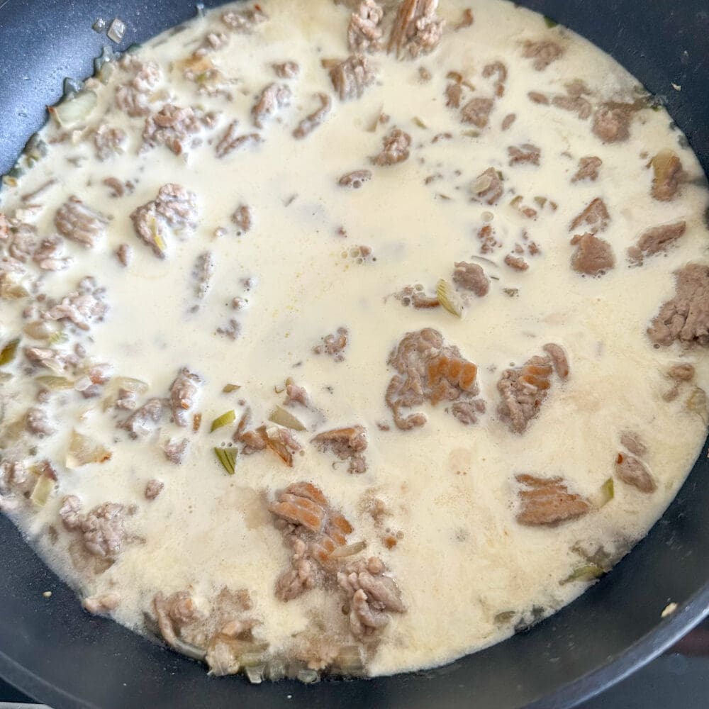 Dann Geflügelbrühe und Sahne angießen und 20 bis 25 Minuten köcheln lassen, bis die Sauce leicht andickt. Nebenbei die Pasta garen. |