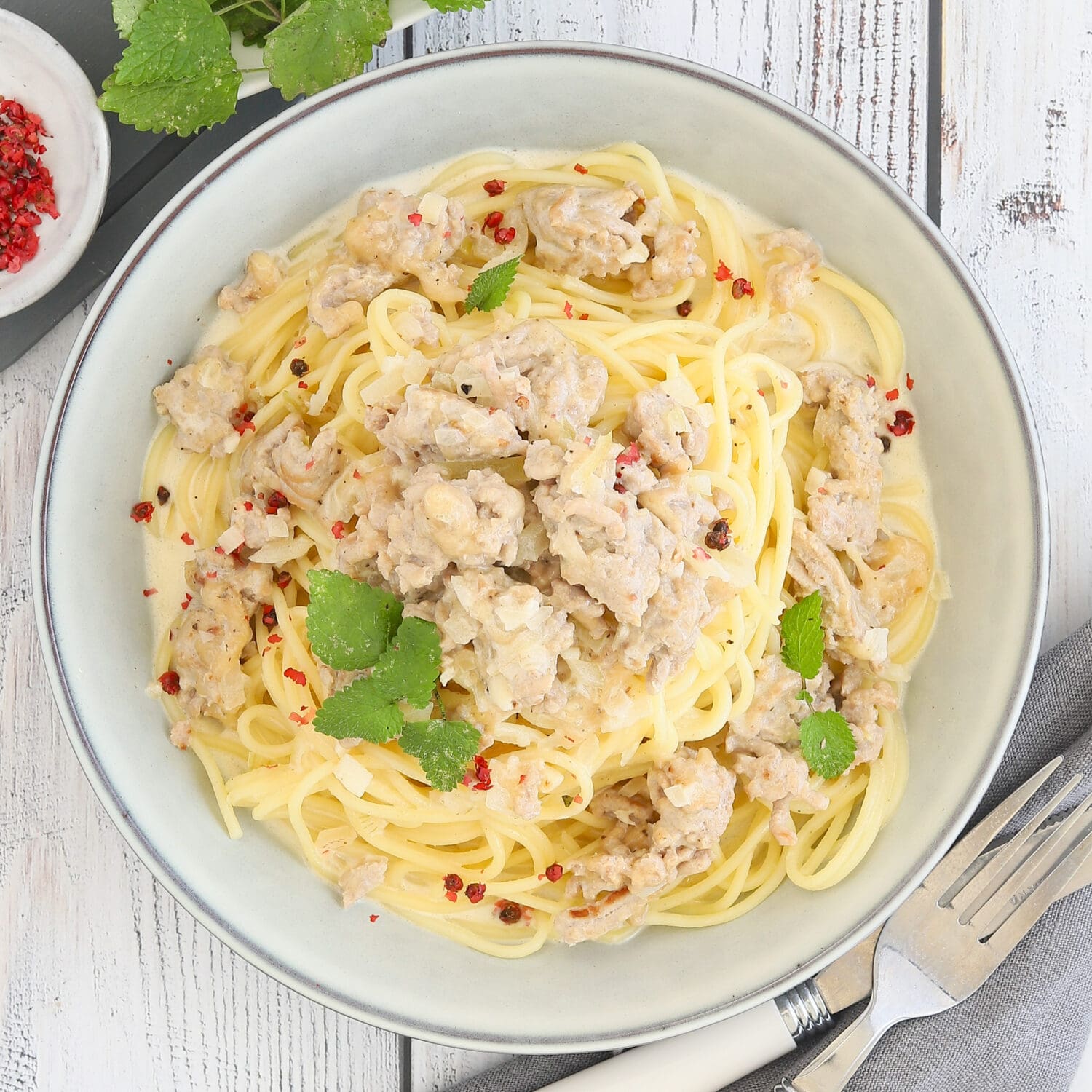 Here come the white version. We proudly present: Weiße Hähnchenhackfleisch-Bolognese mit Spaghetti. Diese Bolognese dürft ihr euch nicht entgehen lassen. 😊